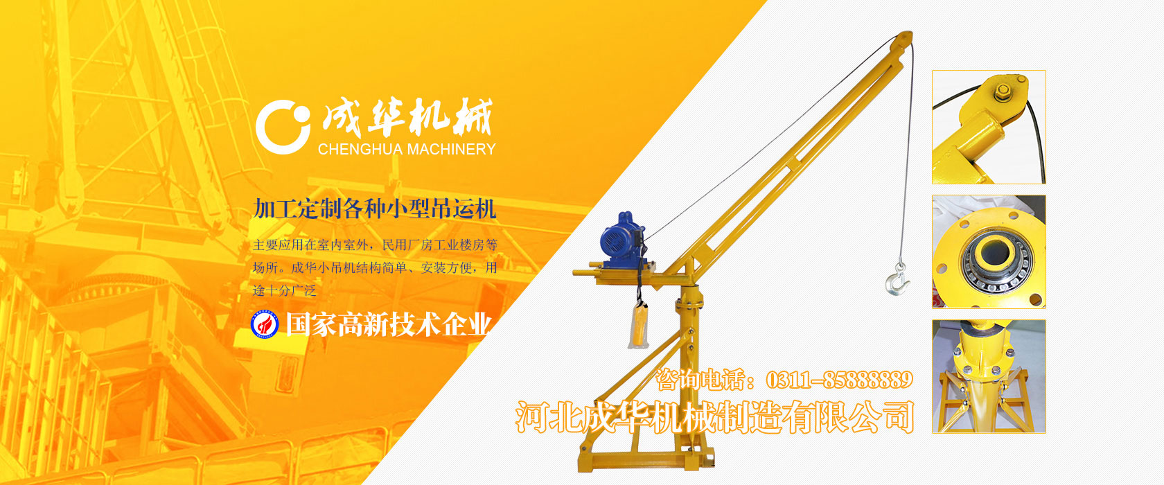 河北成華機械制造有限公司為國家高新技術(shù)企業(yè),旗下吊運機制造廠是家專業(yè)生產(chǎn)制造便攜式小吊機、手提式小吊機附屬工廠,我廠產(chǎn)品主要應(yīng)用在室內(nèi)室外,民用廠房工業(yè)樓房等場所。成華小吊機結(jié)構(gòu)簡單、安裝方便,用途十分廣泛,小吊機產(chǎn)品被廣泛應(yīng)用于機械制造、電子、汽車...